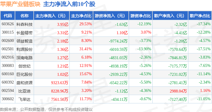 从资金流向上来看,当日苹果产业链板块主力资金净流入5.57亿元,游资资金净流出5.42亿元,散户资金净流出1485.94万元。苹果产业链板块个股资金流向见下表: