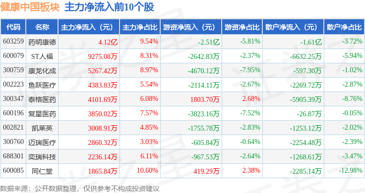 从资金流向上来看,当日健康中国板块主力资金净流出8.67亿元,游资资金净流入5503.46万元,散户资金净流入8.12亿元。健康中国板块个股资金流向见下表: