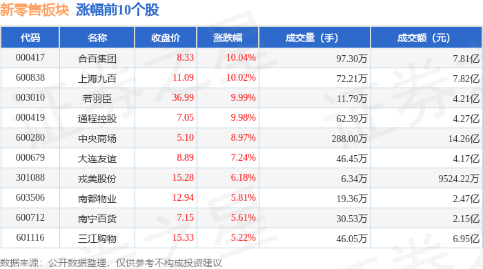 证券之星消息,12月19日新零售板块较上一交易日上涨2.75%,合百集团领涨。当日上证指数报收于3890.45,上涨0.36%。深证成指报收于13140.22,上涨0.66%。新零售板块个股涨跌见下表: