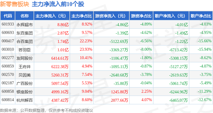 从资金流向上来看,当日新零售板块主力资金净流入12.84亿元,游资资金净流出5.0亿元,散户资金净流出7.85亿元。新零售板块个股资金流向见下表:
