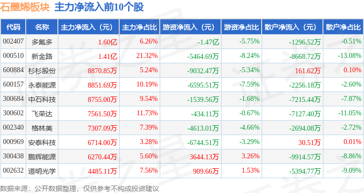 从资金流向上来看,当日石墨烯板块主力资金净流入4.55亿元,游资资金净流出4.18亿元,散户资金净流出3676.97万元。石墨烯板块个股资金流向见下表: