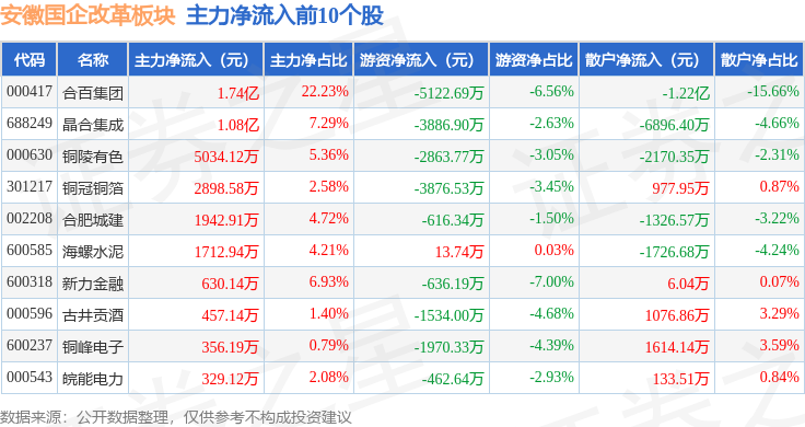 从资金流向上来看,当日安徽国企改革板块主力资金净流出1.32亿元,游资资金净流出1.16亿元,散户资金净流入2.49亿元。安徽国企改革板块个股资金流向见下表: