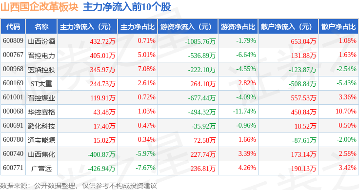 从资金流向上来看,当日山西国企改革板块主力资金净流出1.21亿元,游资资金净流出1531.78万元,散户资金净流入1.36亿元。山西国企改革板块个股资金流向见下表: