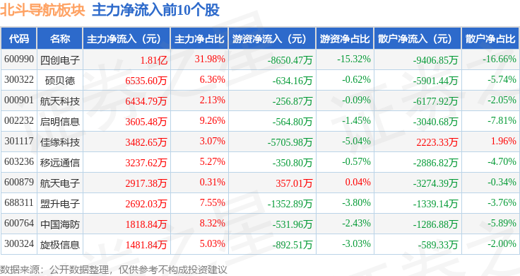 从资金流向上来看,当日北斗导航板块主力资金净流出22.66亿元,游资资金净流入3.33亿元,散户资金净流入19.33亿元。北斗导航板块个股资金流向见下表: