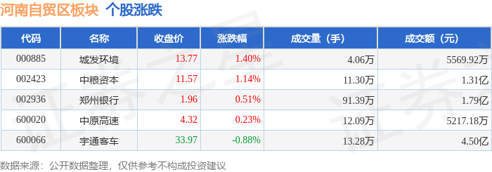 证券之星消息,12月19日河南自贸区板块较上一交易日下跌0.11%,宇通客车领跌。当日上证指数报收于3890.45,上涨0.36%。深证成指报收于13140.22,上涨0.66%。河南自贸区板块个股涨跌见下表: