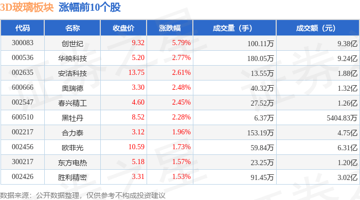 从资金流向上来看,当日3D玻璃板块主力资金净流入6043.34万元,游资资金净流出2.24亿元,散户资金净流入1.63亿元。3D玻璃板块个股资金流向见下表:
