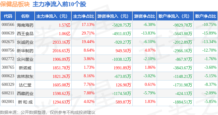 从资金流向上来看,当日保健品板块主力资金净流入1.3亿元,游资资金净流出1.24亿元,散户资金净流出592.01万元。保健品板块个股资金流向见下表: