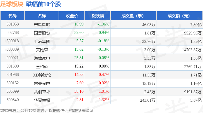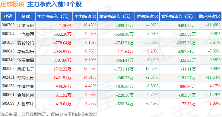 从资金流向上来看,当日足球板块主力资金净流入2.97亿元,游资资金净流出2.35亿元,散户资金净流出6232.21万元。足球板块个股资金流向见下表:
