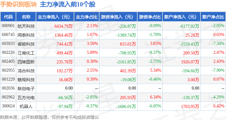 从资金流向上来看,当日手势识别板块主力资金净流出3732.0万元,游资资金净流入9356.57万元,散户资金净流出5624.58万元。手势识别板块个股资金流向见下表: