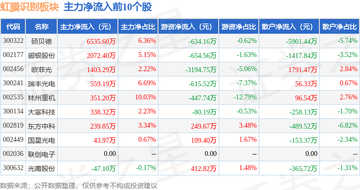 从资金流向上来看,当日虹膜识别板块主力资金净流入1343.04万元,游资资金净流出3058.31万元,散户资金净流入1715.27万元。虹膜识别板块个股资金流向见下表: