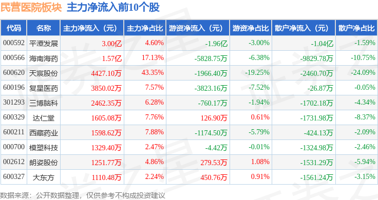 从资金流向上来看,当日民营医院板块主力资金净流出4.85亿元,游资资金净流入393.43万元,散户资金净流入4.81亿元。民营医院板块个股资金流向见下表:
