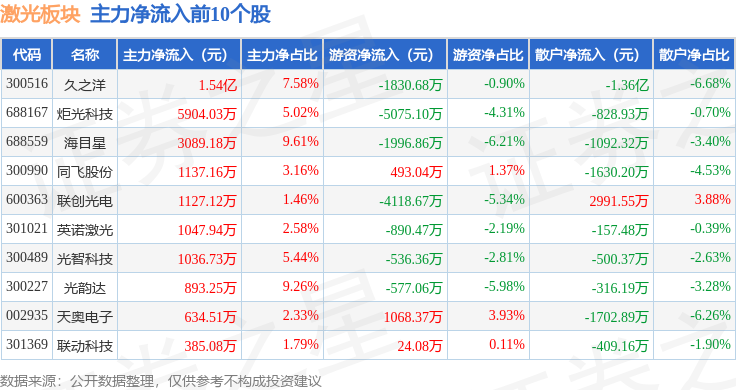 从资金流向上来看,当日激光板块主力资金净流出7.54亿元,游资资金净流入8144.77万元,散户资金净流入6.72亿元。激光板块个股资金流向见下表: