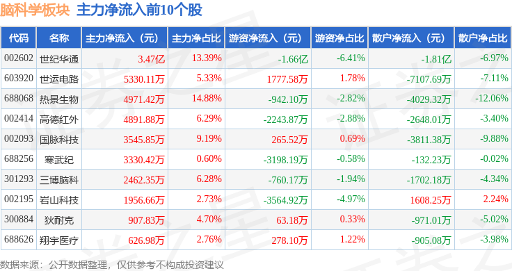 从资金流向上来看,当日脑科学板块主力资金净流出3.12亿元,游资资金净流出5666.14万元,散户资金净流入3.69亿元。脑科学板块个股资金流向见下表: