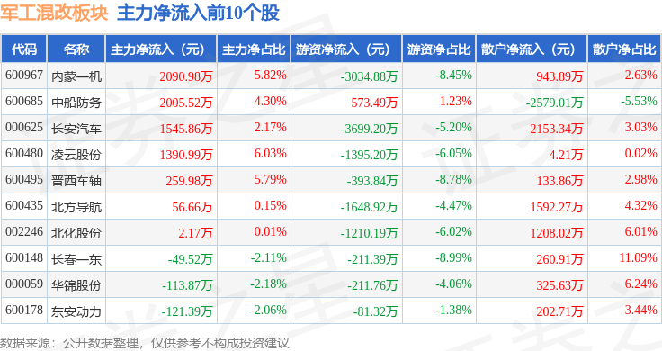从资金流向上来看,当日军工混改板块主力资金净流出7902.68万元,游资资金净流出1.37亿元,散户资金净流入2.16亿元。军工混改板块个股资金流向见下表: