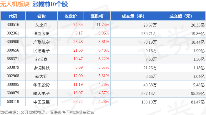 从资金流向上来看,当日无人机板块主力资金净流出2.88亿元,游资资金净流出5.52亿元,散户资金净流入8.4亿元。无人机板块个股资金流向见下表: