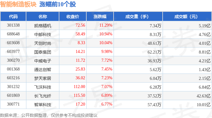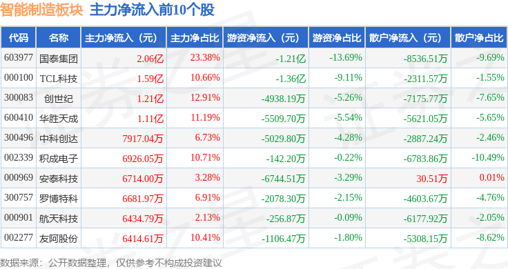 从资金流向上来看,当日智能制造板块主力资金净流出13.59亿元,游资资金净流出14.88亿元,散户资金净流入28.46亿元。智能制造板块个股资金流向见下表: