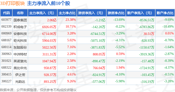 从资金流向上来看,当日3D打印板块主力资金净流出3.06亿元,游资资金净流出3.26亿元,散户资金净流入6.31亿元。3D打印板块个股资金流向见下表: