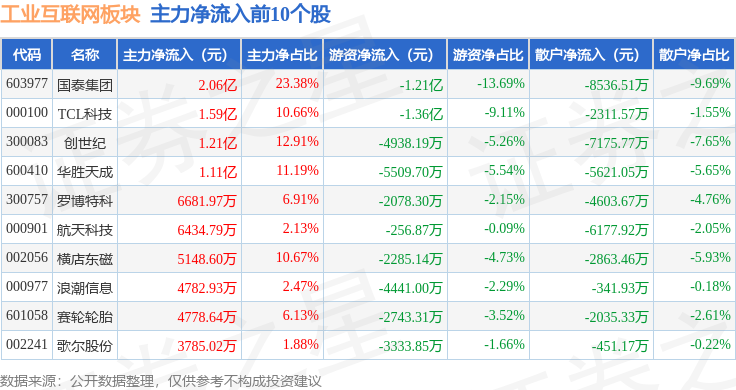 从资金流向上来看,当日工业互联网板块主力资金净流出3.69亿元,游资资金净流出7.89亿元,散户资金净流入11.58亿元。工业互联网板块个股资金流向见下表: