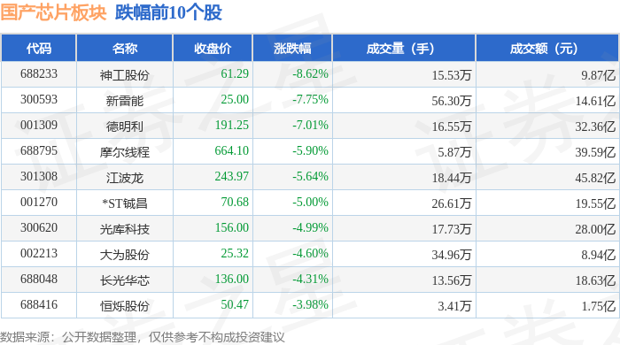 证券之星消息,12月19日国产芯片板块较上一交易日下跌0.1%,神工股份领跌。当日上证指数报收于3890.45,上涨0.36%。深证成指报收于13140.22,上涨0.66%。国产芯片板块个股涨跌见下表: