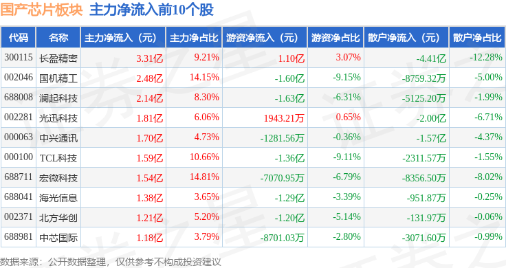 从资金流向上来看,当日国产芯片板块主力资金净流出41.26亿元,游资资金净流入11.16亿元,散户资金净流入30.1亿元。国产芯片板块个股资金流向见下表: