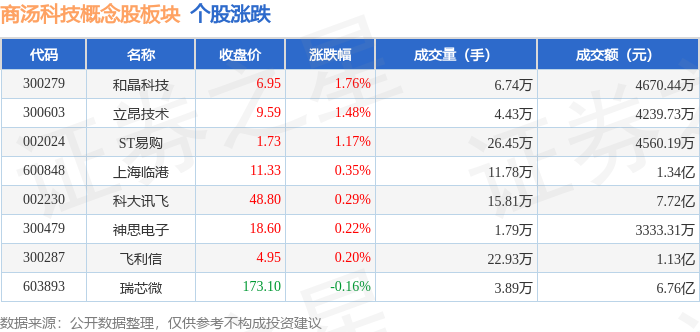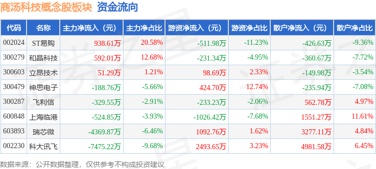 从资金流向上来看,当日商汤科技概念股板块主力资金净流出1.13亿元,游资资金净流入2106.84万元,散户资金净流入9199.51万元。商汤科技概念股板块个股资金流向见下表: