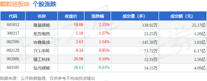 证券之星消息,12月19日颗粒硅板块较上一交易日上涨1.6%,隆基绿能领涨。当日上证指数报收于3890.45,上涨0.36%。深证成指报收于13140.22,上涨0.66%。颗粒硅板块个股涨跌见下表: