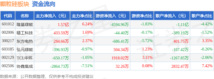 从资金流向上来看,当日颗粒硅板块主力资金净流入1.25亿元,游资资金净流出2871.14万元,散户资金净流出9646.21万元。颗粒硅板块个股资金流向见下表: