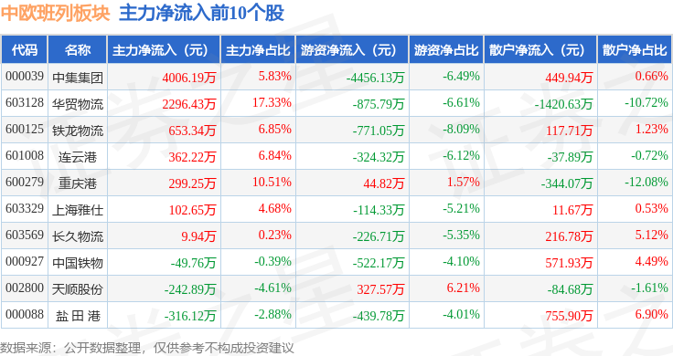 从资金流向上来看,当日中欧班列板块主力资金净流出2.72亿元,游资资金净流出8434.32万元,散户资金净流入3.56亿元。中欧班列板块个股资金流向见下表: