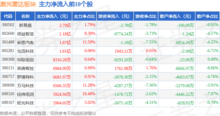 从资金流向上来看,当日激光雷达板块主力资金净流出10.05亿元,游资资金净流出2.34亿元,散户资金净流入12.39亿元。激光雷达板块个股资金流向见下表: