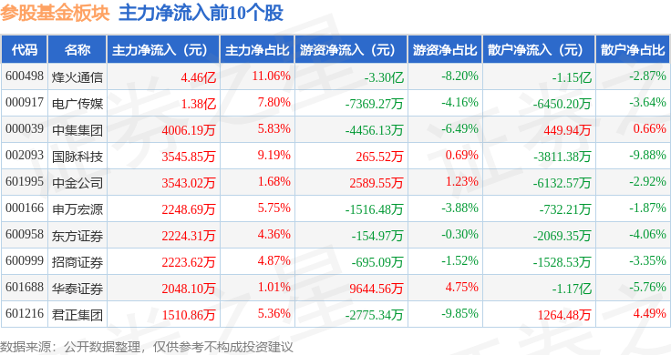 从资金流向上来看,当日参股基金板块主力资金净流出4.82亿元,游资资金净流出378.85万元,散户资金净流入4.86亿元。参股基金板块个股资金流向见下表: