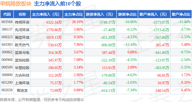 从资金流向上来看,当日甲烷排放板块主力资金净流入7052.88万元,游资资金净流出3264.48万元,散户资金净流出3788.41万元。甲烷排放板块个股资金流向见下表: