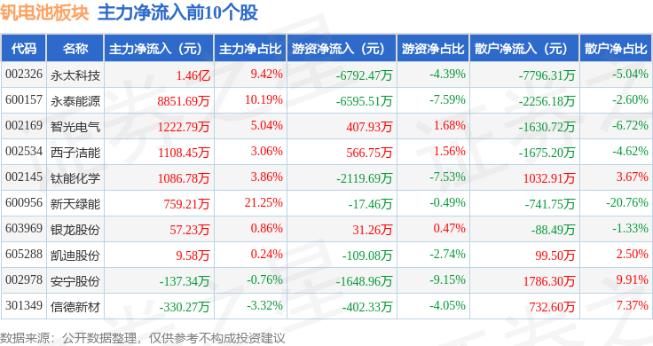 从资金流向上来看,当日钒电池板块主力资金净流入1.19亿元,游资资金净流出1.51亿元,散户资金净流入3220.4万元。钒电池板块个股资金流向见下表: