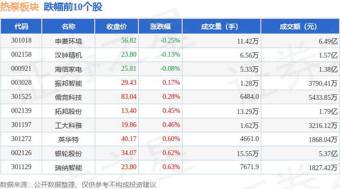 从资金流向上来看,当日热泵板块主力资金净流入16.9亿元,游资资金净流出11.56亿元,散户资金净流出5.34亿元。热泵板块个股资金流向见下表: