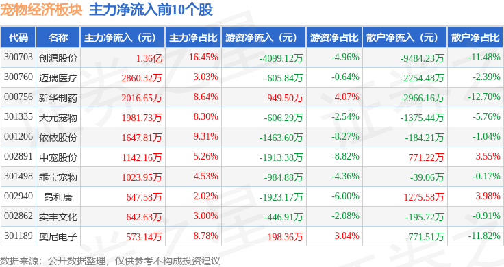 从资金流向上来看,当日宠物经济板块主力资金净流出345.87万元,游资资金净流出1.17亿元,散户资金净流入1.21亿元。宠物经济板块个股资金流向见下表: