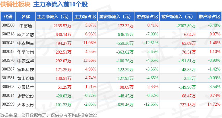 从资金流向上来看,当日供销社板块主力资金净流出4116.19万元,游资资金净流出2367.14万元,散户资金净流入6483.33万元。供销社板块个股资金流向见下表:
