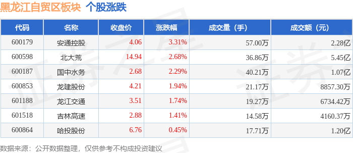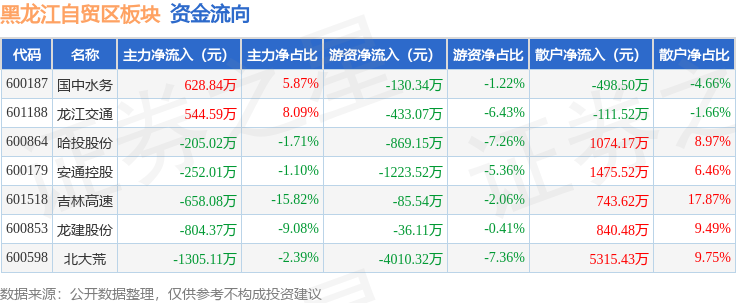 从资金流向上来看,当日黑龙江自贸区板块主力资金净流出2051.16万元,游资资金净流出6788.06万元,散户资金净流入8839.21万元。黑龙江自贸区板块个股资金流向见下表: