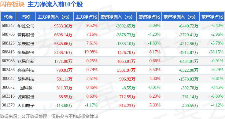 从资金流向上来看,当日闪存板块主力资金净流出15.79亿元,游资资金净流入7.9亿元,散户资金净流入7.89亿元。闪存板块个股资金流向见下表: