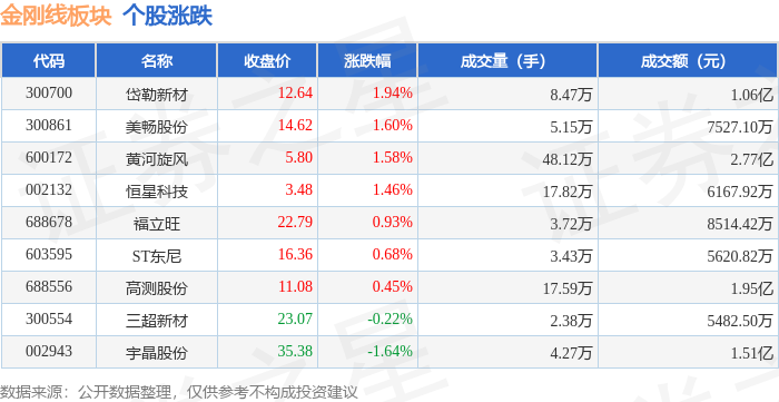 证券之星消息,12月19日金刚线板块较上一交易日上涨0.82%,岱勒新材领涨。当日上证指数报收于3890.45,上涨0.36%。深证成指报收于13140.22,上涨0.66%。金刚线板块个股涨跌见下表: