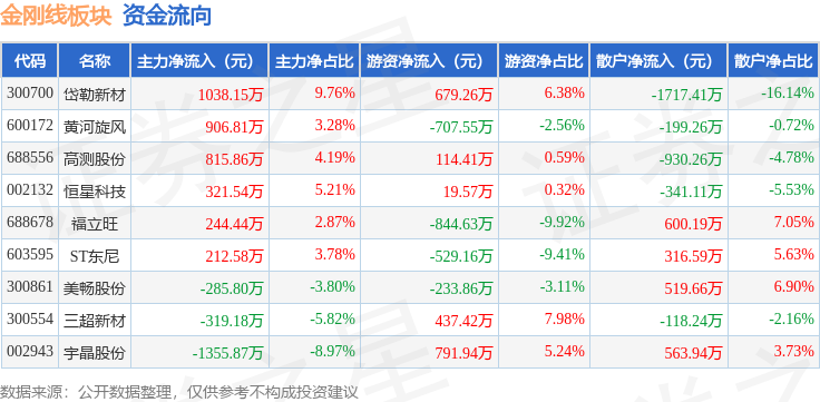 从资金流向上来看,当日金刚线板块主力资金净流入1578.52万元,游资资金净流出272.62万元,散户资金净流出1305.9万元。金刚线板块个股资金流向见下表: