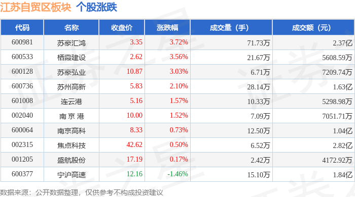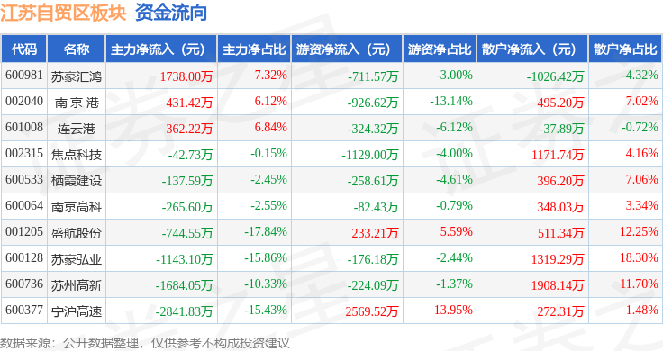 从资金流向上来看,当日江苏自贸区板块主力资金净流出4327.83万元,游资资金净流出1030.11万元,散户资金净流入5357.94万元。江苏自贸区板块个股资金流向见下表: