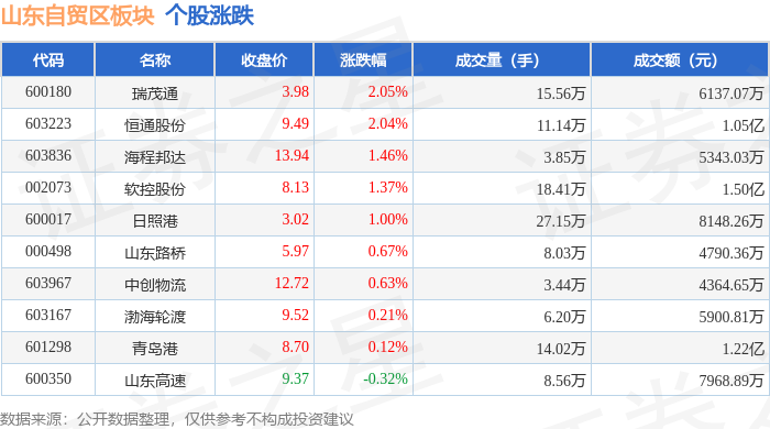 证券之星消息,12月19日山东自贸区板块较上一交易日上涨0.33%,瑞茂通领涨。当日上证指数报收于3890.45,上涨0.36%。深证成指报收于13140.22,上涨0.66%。山东自贸区板块个股涨跌见下表: