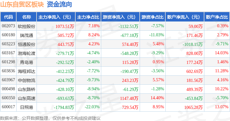 从资金流向上来看,当日山东自贸区板块主力资金净流出2302.83万元,游资资金净流入200.2万元,散户资金净流入2102.63万元。山东自贸区板块个股资金流向见下表: