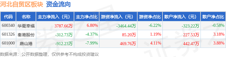 从资金流向上来看,当日河北自贸区板块主力资金净流入2562.7万元,游资资金净流出2909.48万元,散户资金净流入346.78万元。河北自贸区板块个股资金流向见下表: