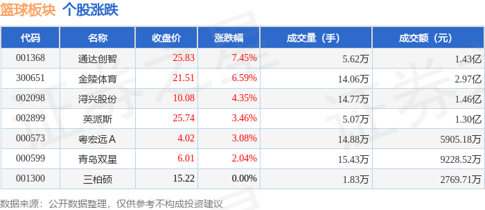 证券之星消息,12月19日篮球板块较上一交易日上涨3.03%,通达创智领涨。当日上证指数报收于3890.45,上涨0.36%。深证成指报收于13140.22,上涨0.66%。篮球板块个股涨跌见下表: