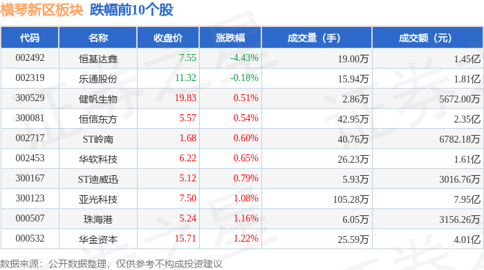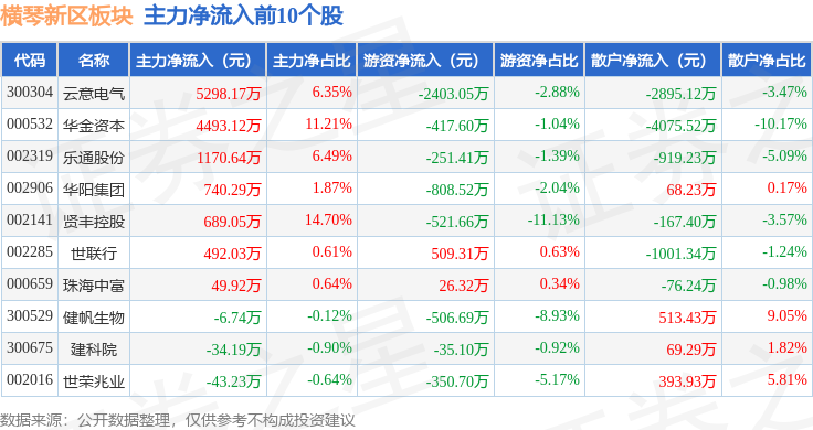 从资金流向上来看,当日横琴新区板块主力资金净流出1.86亿元,游资资金净流入1.19亿元,散户资金净流入6733.95万元。横琴新区板块个股资金流向见下表: