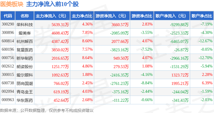 从资金流向上来看,当日医美板块主力资金净流出2.48亿元,游资资金净流出3119.94万元,散户资金净流入2.79亿元。医美板块个股资金流向见下表: