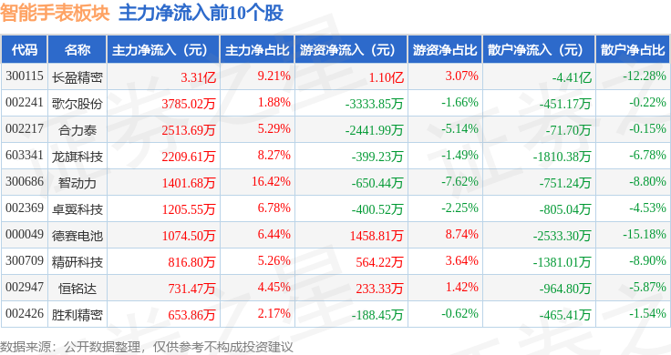 从资金流向上来看,当日智能手表板块主力资金净流出2.73亿元,游资资金净流入2.89亿元,散户资金净流出1591.39万元。智能手表板块个股资金流向见下表: