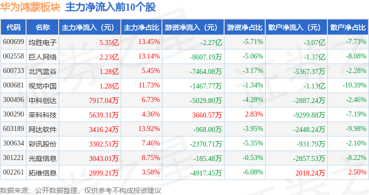 从资金流向上来看,当日华为鸿蒙板块主力资金净流入8.88亿元,游资资金净流出5.48亿元,散户资金净流出3.41亿元。华为鸿蒙板块个股资金流向见下表: