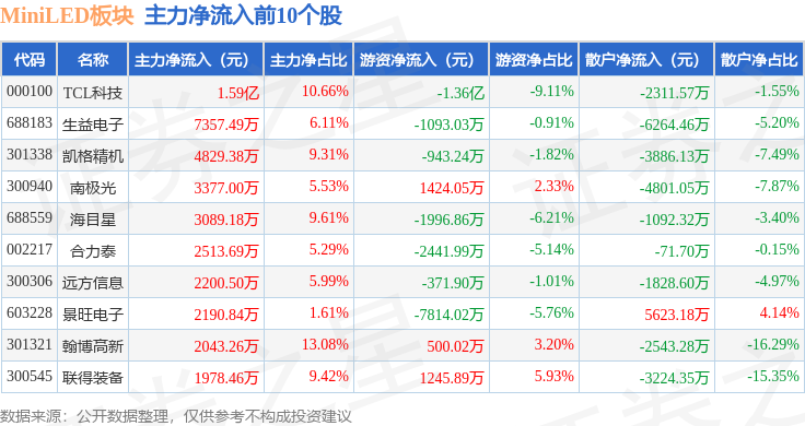 从资金流向上来看,当日MiniLED板块主力资金净流出9.15亿元,游资资金净流出5177.04万元,散户资金净流入9.67亿元。MiniLED板块个股资金流向见下表: