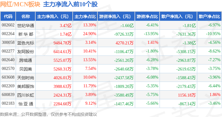从资金流向上来看,当日网红/MCN板块主力资金净流入5.08亿元,游资资金净流出3.78亿元,散户资金净流出1.3亿元。网红/MCN板块个股资金流向见下表: